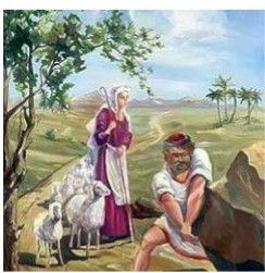JACOB CONTINUED ON his way, getting ever farther away from his brother Esau's wrath. At last he reached Haran, the place where his uncle Laban dwelt. He saw a green field, and in the field a well. Three flocks of sheep were lying there, resting, and waiting to be watered.
